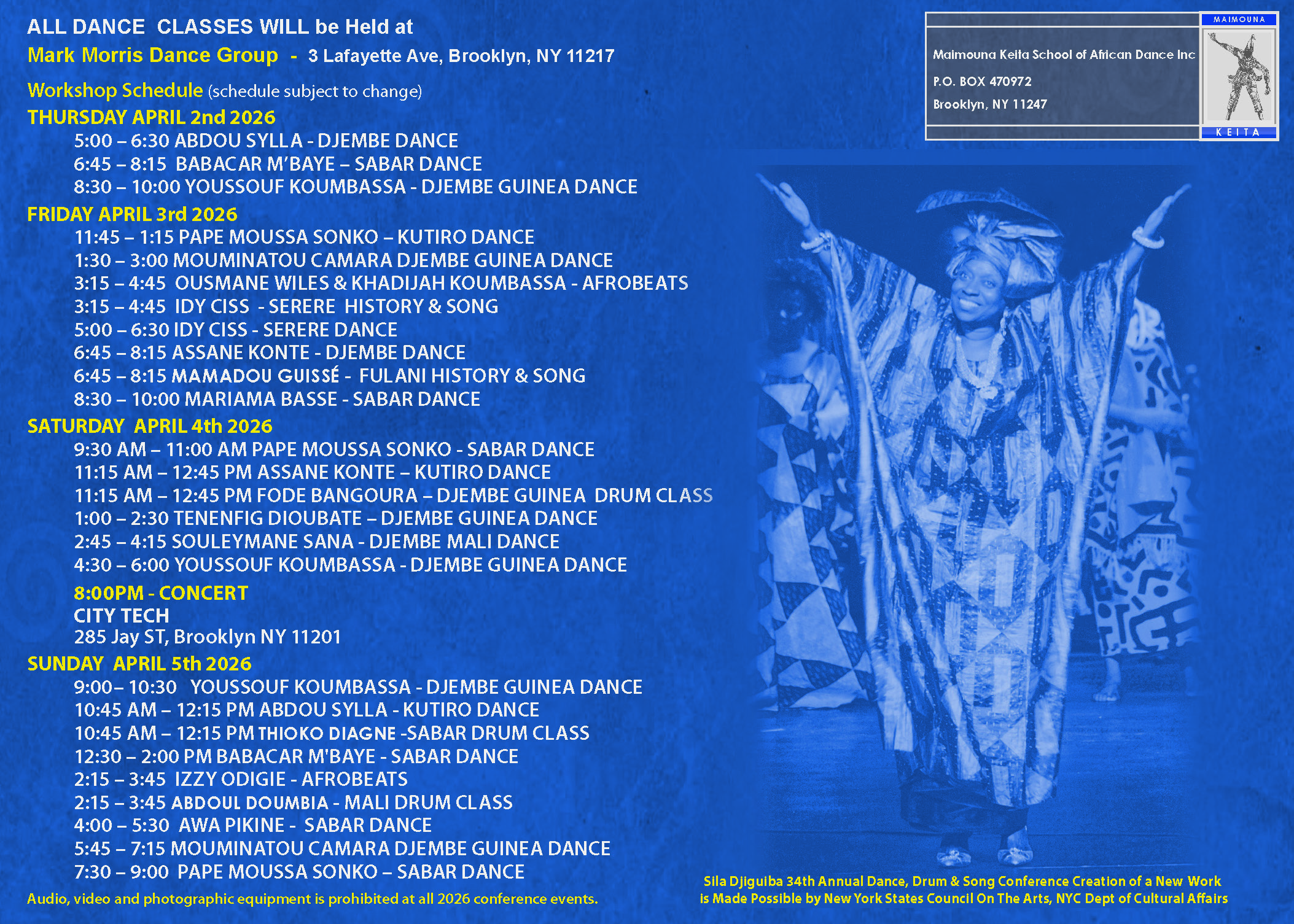 Maimouna Keita School of African Dance will celebrate 34 years of hosting one of the largest conferences and concerts, April 2-5, 2026 in Brooklyn, NY. The conference attracts hundreds of people from all over the world to partake in a four day immersion of dance, drum, music and history. Members of the MKSAD performing company will prepare for an authentic, enthralling concert performance that will showcase the traditional relevance of dance and music, arts and culture and its impact.